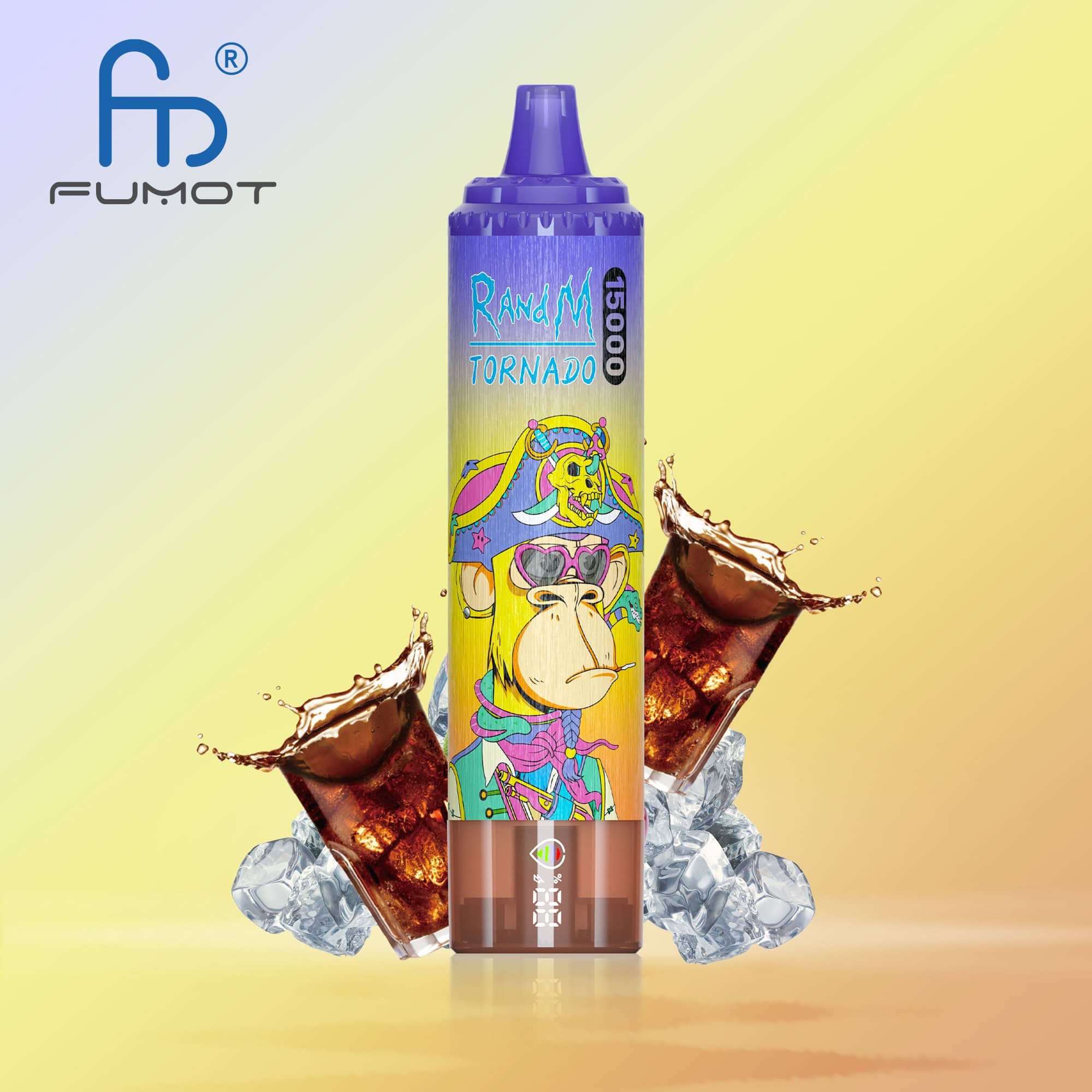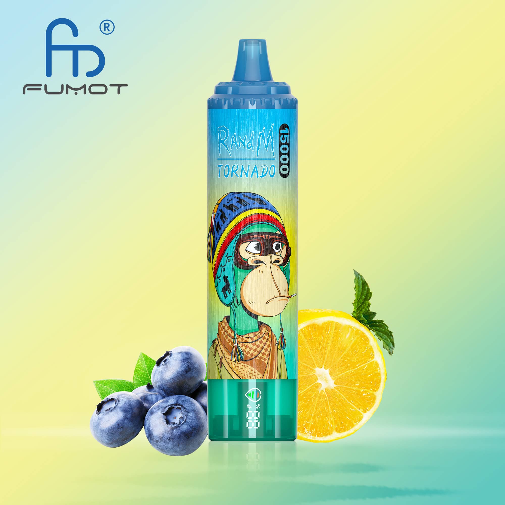 Fumot Tornado 15000 tilbyder op til 15.000 sug med en forudfyldt e-væskekapacitet på 25 ml og nikotinstyrker på 0%/2%/3%/5%. Drevet af et 850 mAh genopladeligt batteri har enheden en mesh-coil til jævn opvarmning og et display til overvågning af batteri- og væskestand. Fås i forskellige smagsvarianter såsom Peach Ice, Blue Razz Lemonade og Kiwi Passion Fruit Guava.