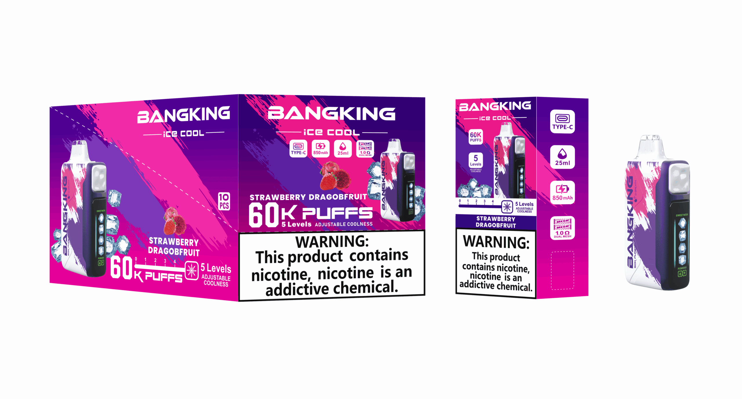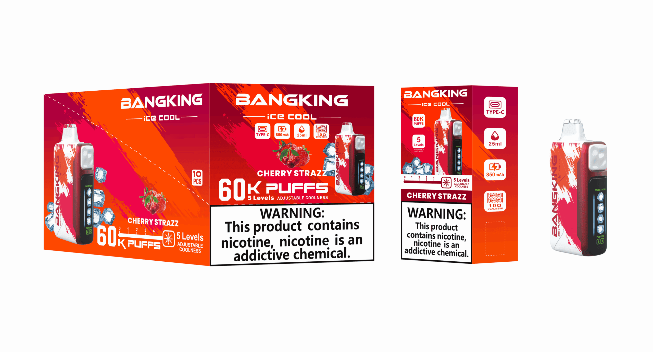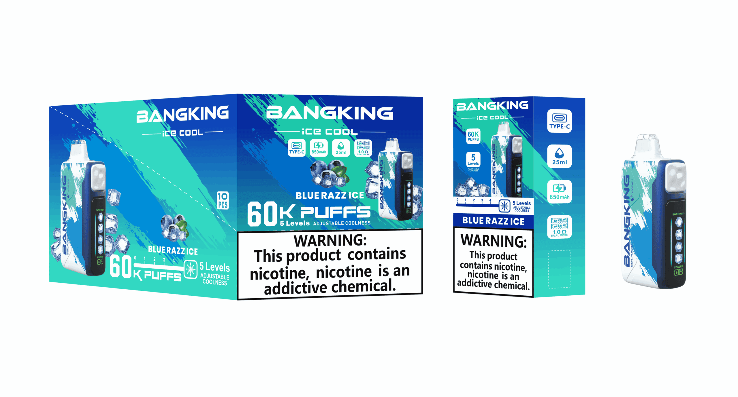 Die Bang King Ice Cool 60000 E-Zigarette bietet bis zu 60.000 Züge mit 25ml Tank und flexiblen Nikotinstärken (0-5%). Mit 1,0Ω Mesh-Coil, 5 einstellbaren Kühlstufen, 850mAh Akku, LED-Display und USB-C Schnellladung. 12 Premium-Geschmacksrichtungen für individuellen Dampfgenuss.