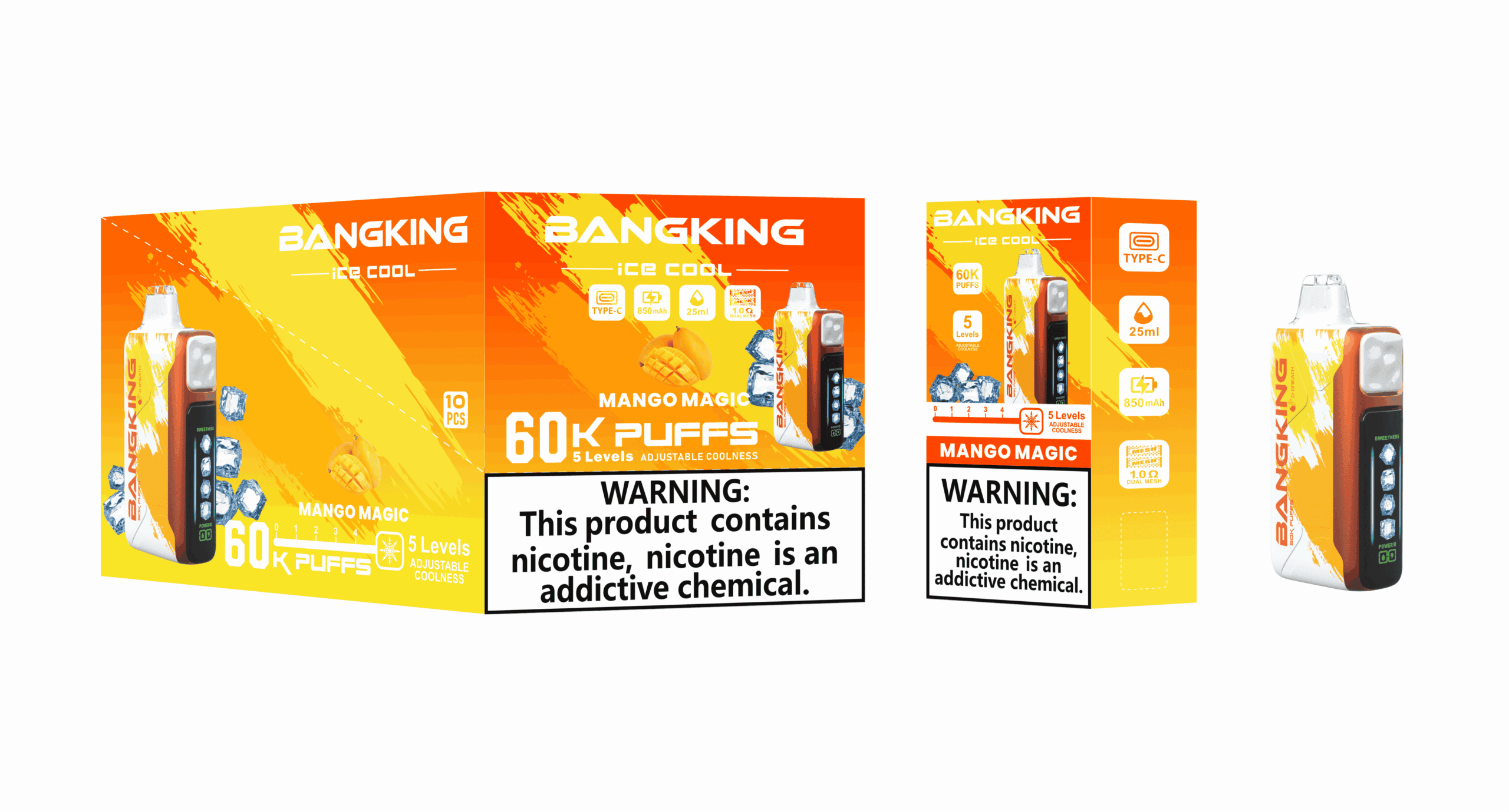 Erhältlich in 12 meisterhaft kreierten Premium-Geschmacksrichtungen, die ein breites Spektrum an Geschmackspräferenzen befriedigen, bietet die Bang King Ice Cool 60000 für jeden Gaumen und jede Stimmung etwas Passendes. Praktisch verpackt als 10 Stück pro Packung, ist dieses Gerät perfekt für Einzelhandelsauslagen oder Großhandelsbestellungen und vereint professionelle Leistung, modernste Funktionen und außergewöhnliches Preis-Leistungs-Verhältnis in einer herausragenden Dampflösung.