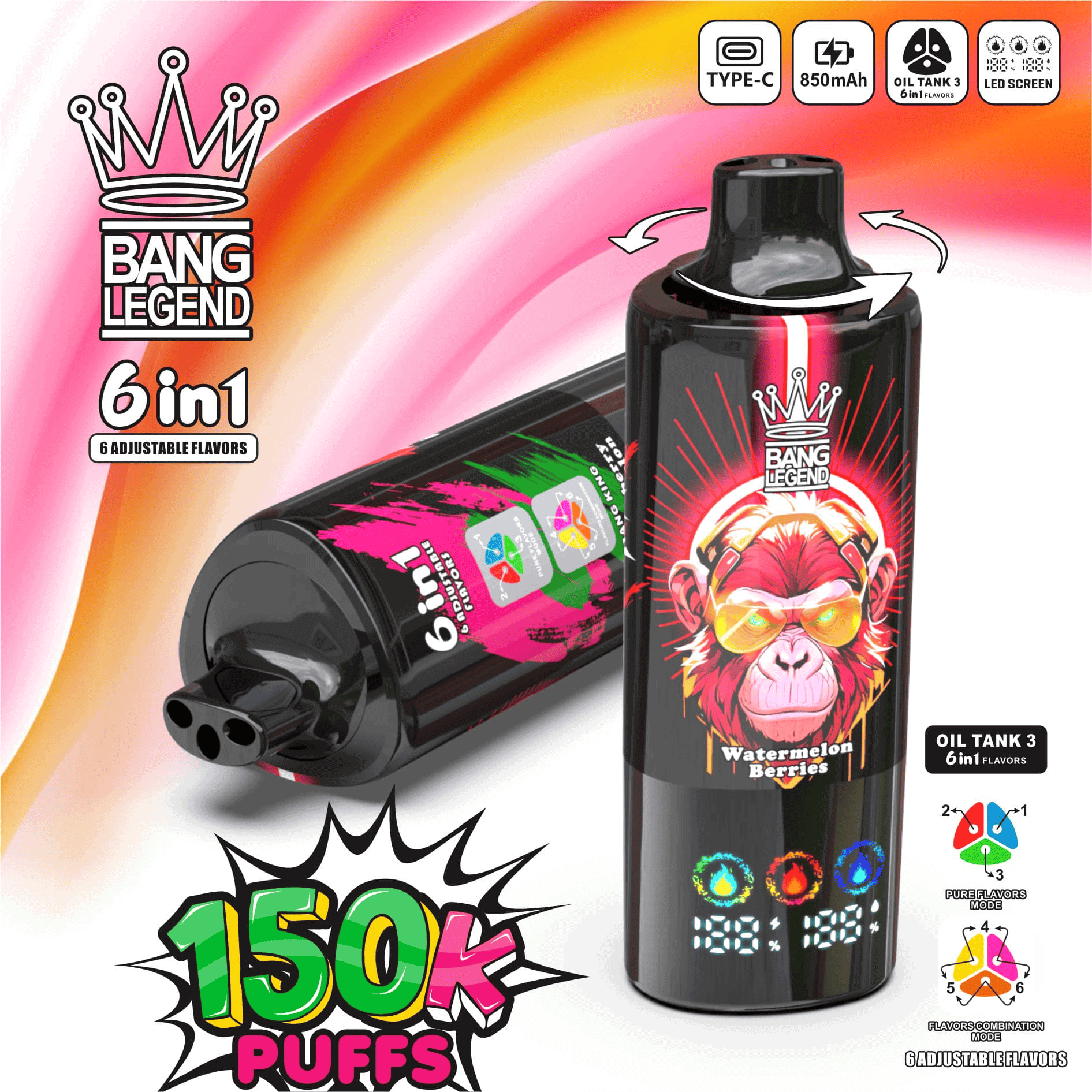 Die Bang Legend 150K Einweg E-Zigarette mit 6-in-1 Funktion setzt neue Maßstäbe mit bis zu 150.000 Zügen und einem revolutionären Drei-Tank-System. Mit drei Nikotinstärken (0%/2%/3%/5%) und sechs Aromamodi bietet sie unübertroffene Individualisierung. Die Mesh-Coil liefert intensive Geschmackserlebnisse, während das intelligente LED-Display und der 850mAh Akku für Kontrolle und Langlebigkeit sorgen. Perfekt für Dampfer-Enthusiasten und Händler.