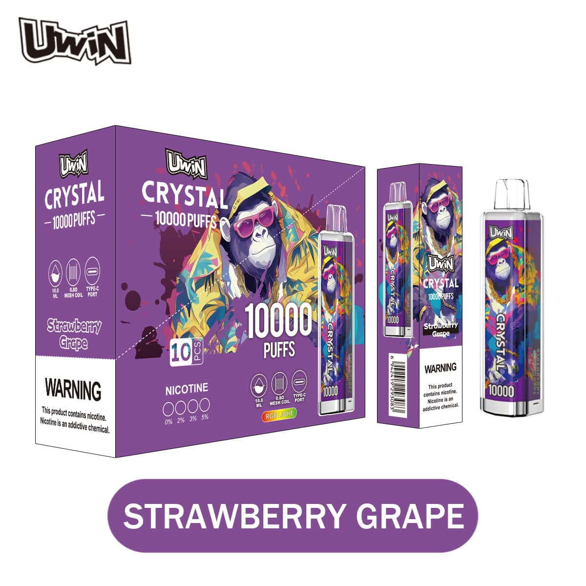 Uwin Crystal 10000 drivs av ett 650 mAh-batteri med typ C-laddningsport och erbjuder effektiv energi och snabb laddning för oavbruten njutning. De lysande RGB-lamporna ger enheten en iögonfallande estetik som gör varje drag visuellt tilltalande och kombinerar stil med funktionalitet i en kompakt enhet.